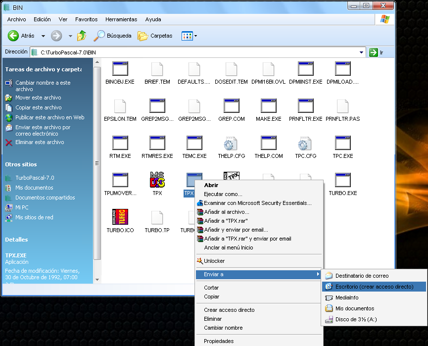 Ahora crearemos un acceso directo en nuestro escritorio, abriremos la carpeta TurboPascal-7.0 y iremos a la carpeta llamada BIN.